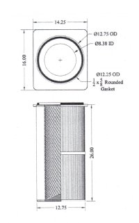 Cartridge filter 12.75 O.D. x 8.38" I.D. x 26" lg 90 Pleats 86.70 sq ft of Spun Bonded Polyester FR filter Media Gasket 5/8" high x 1/2" wide MAX Temp 200 deg F (93 deg C)
